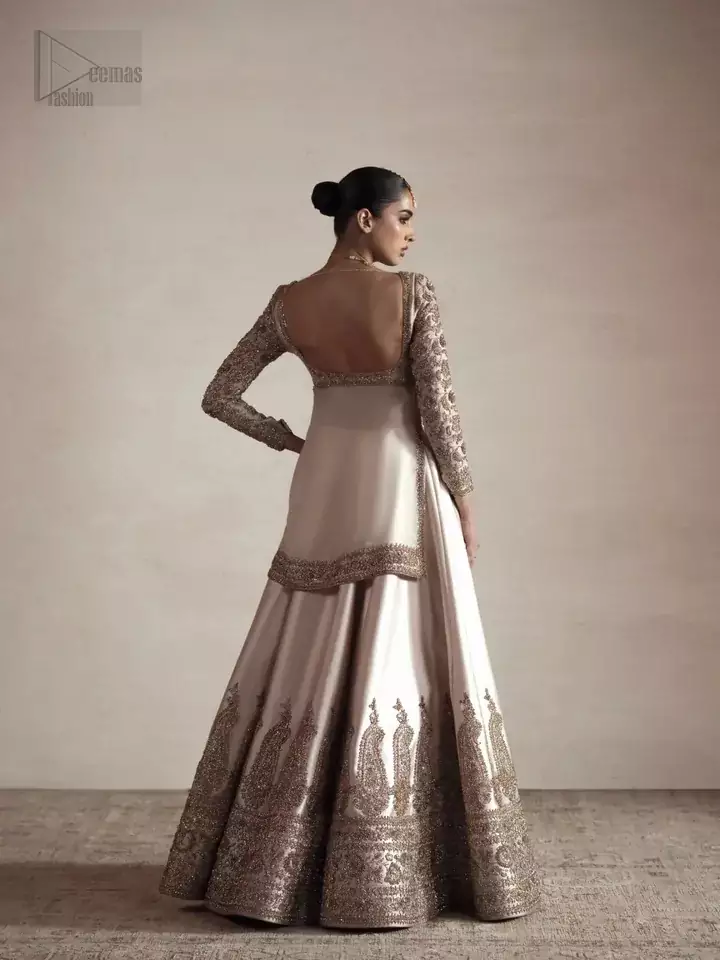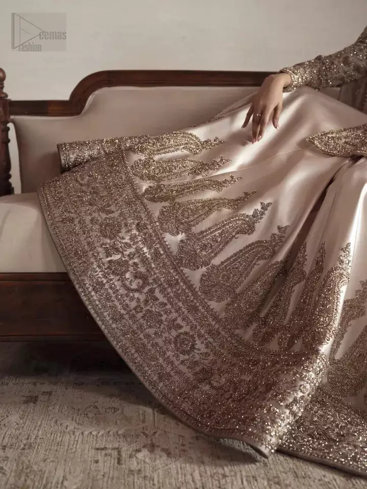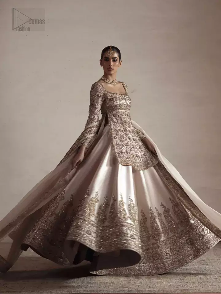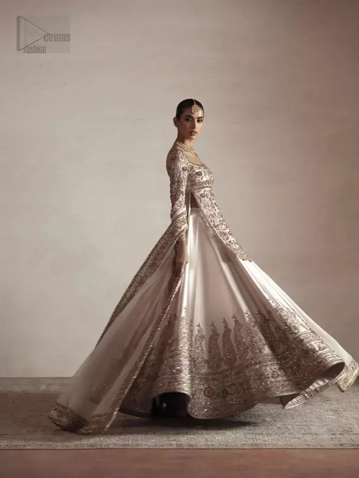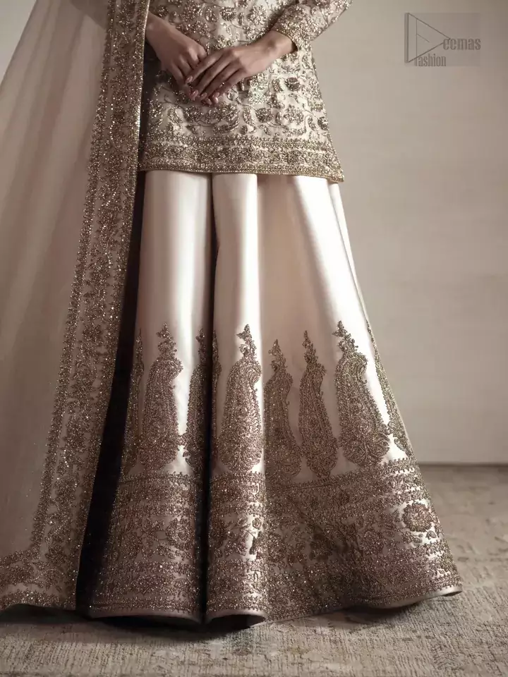The ivory short shirt completes a tale of majesty and charm with a lehenga that embodies utmost sophistication. The fabrics used to craft this work of art reflect true dedication, with organza and pure silk, adding to its regal nature. The short shirt features a flawless square neckline, below which you’ll find the most delicately executed light golden embroidery, sculptured into the fabric. The shirt boasts a side-opening design and is full-sleeved to complete the sophisticated aura of this outfit. Let the bride radiate her glow at her nikkah ceremony with this exquisite masterpiece.