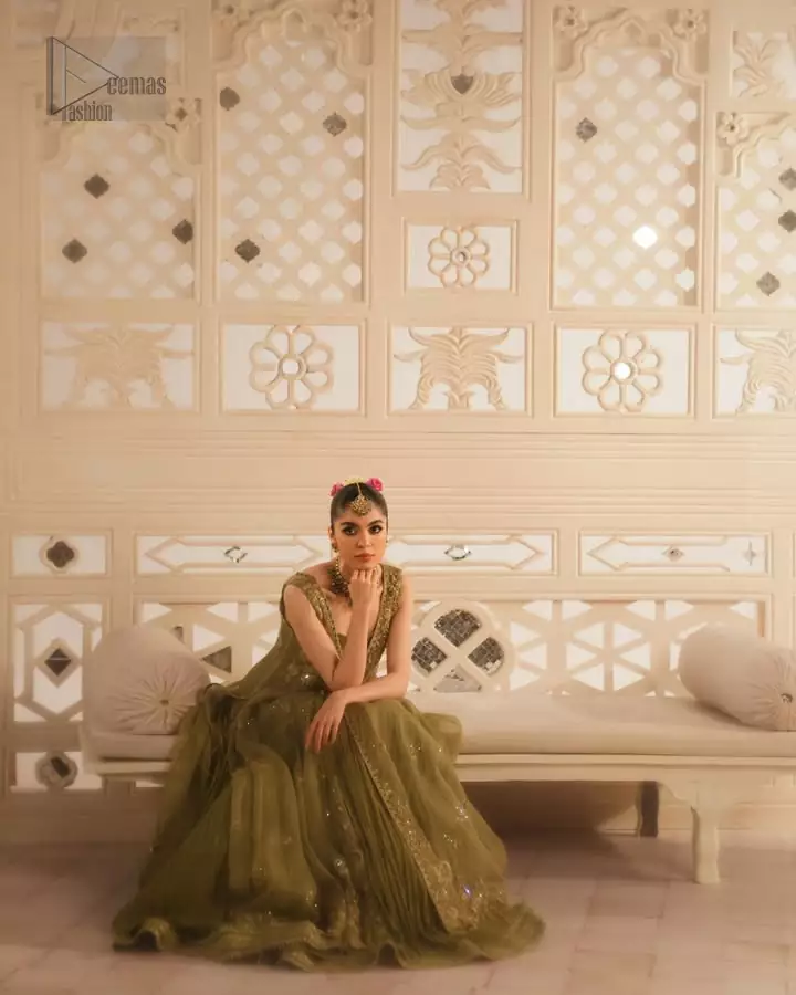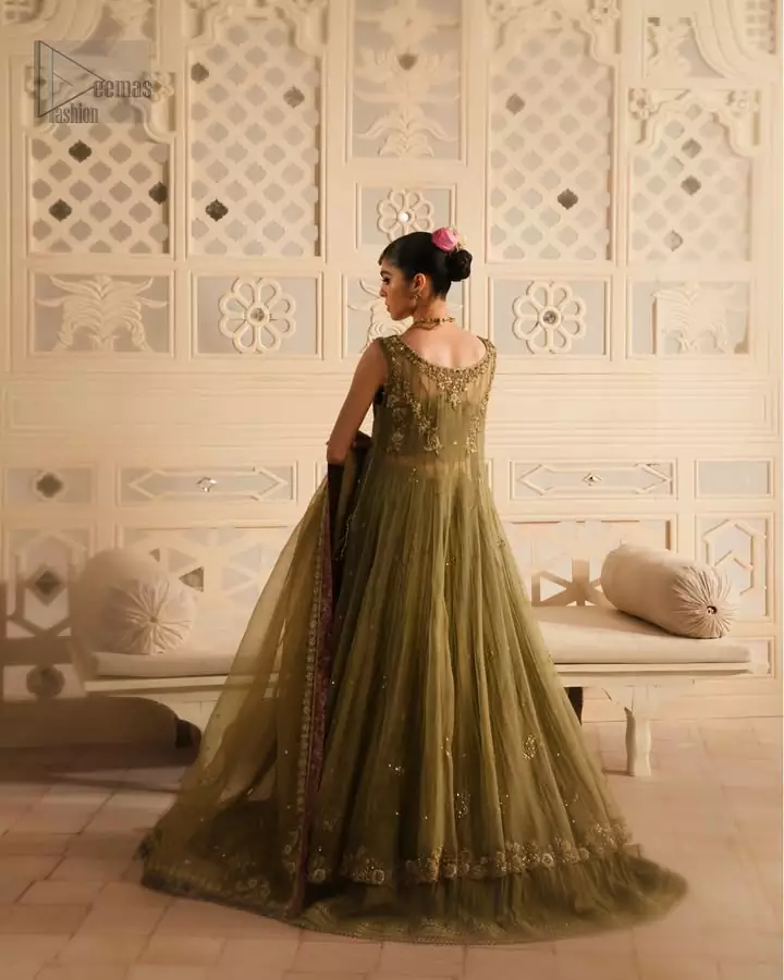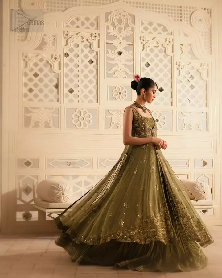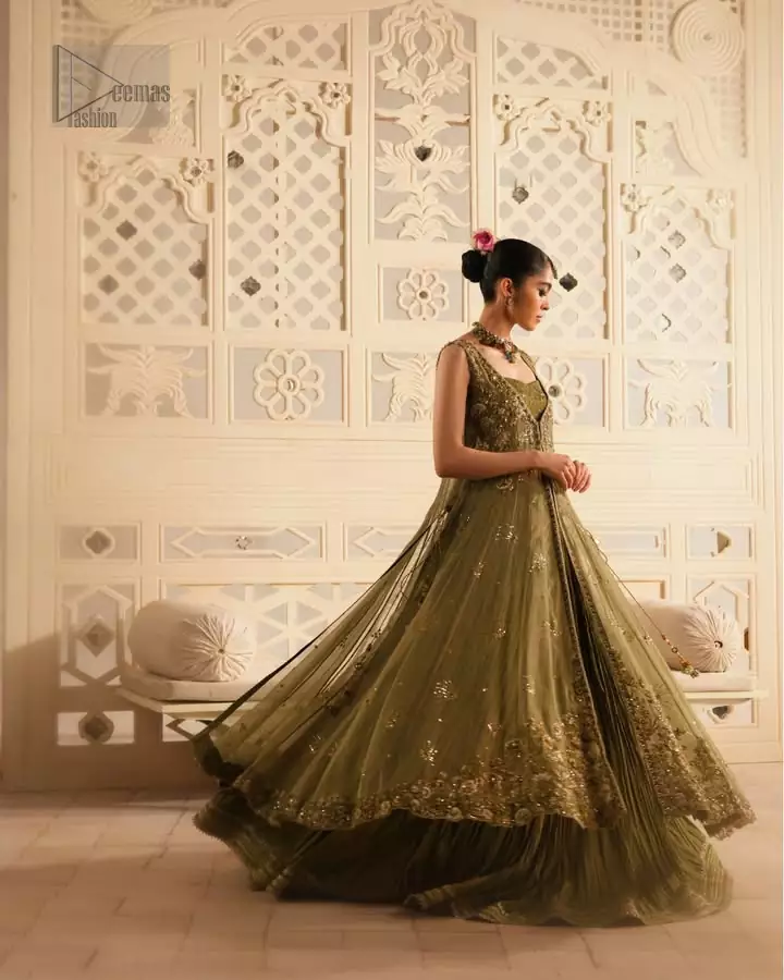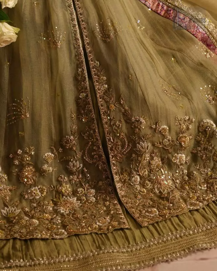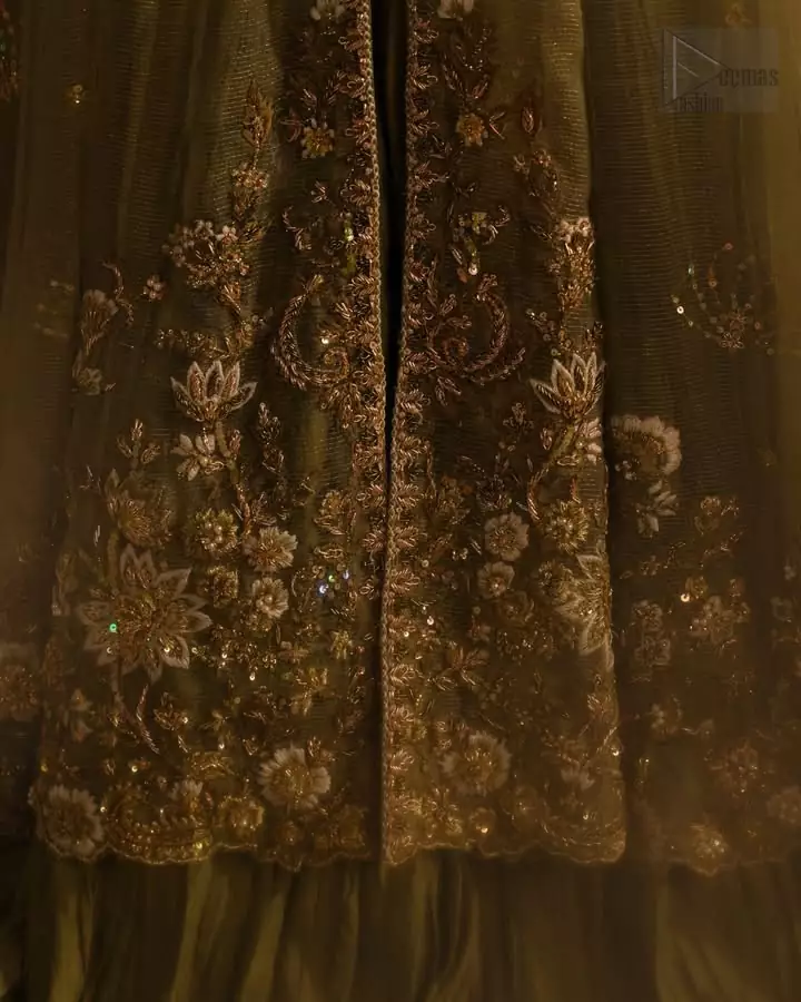 A uniquely stunning sensation flares up with the olive-green front-open gown paired with a fabulous crushed lehenga. This outstanding ensemble features the most sophisticated work of antique golden-thread embroidery, a charismatic addition below its beautiful square neckline. The sleeveless gown, with its side-open pattern, gives it a modern and traditional touch. Every stitch speaks of the fine craftsmanship that’s purely skilled and designed for the queen of the night. The entire grandeur of this attire is topped with a net dupatta, completing your look and making your mehndi celebrations truly memorable.