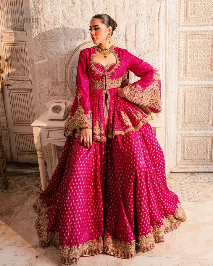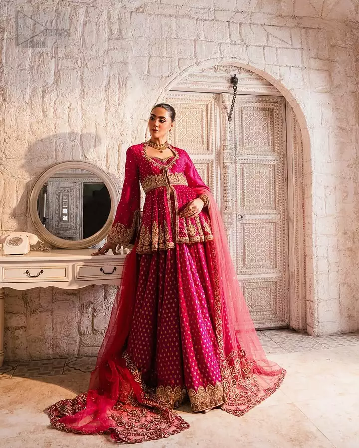 A raspberry peplum pairs beautifully with a matching lehenga to create an outfit full of charm and colour. The raw silk and net fabric highlight every detail, from the front-open design to the graceful sweetheart neckline. Bell sleeves add a touch of elegance, while golden embroidery in fuchsia and shocking pink tones brings the entire look to life. The dupatta ties everything together with a soft, regal finish, making this ensemble an ideal choice for reception and first-day celebrations.