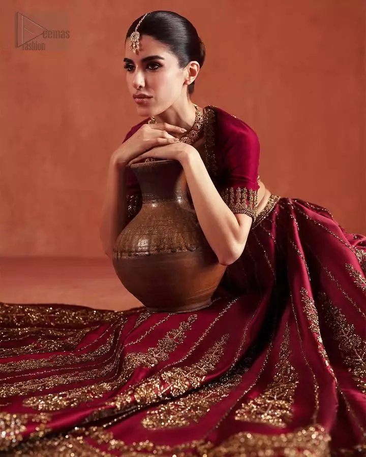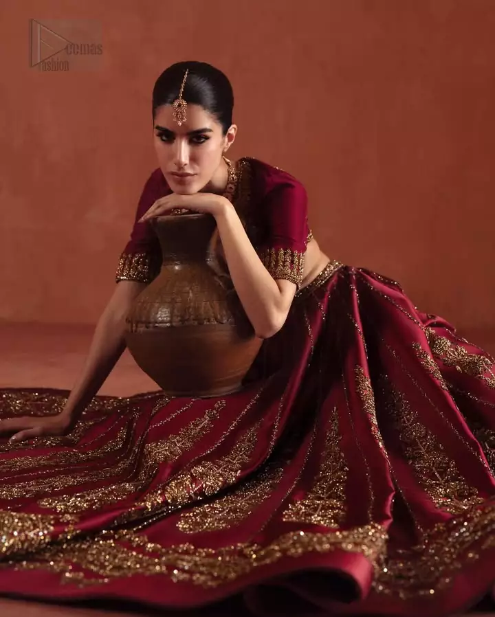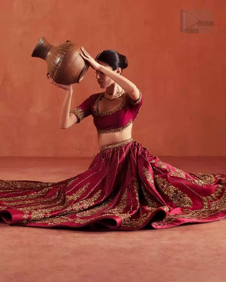 Nothing beats the traditional style, where a ruby-red flared lehenga pairs with a blouse and dupatta. This attire is a masterpiece in its own right, embodying the true spirit of South Asian fashion. The half-sleeve shirt features a fabulous round neckline that frames exquisite golden antique embroidery. Organza and pure silk are two fabrics that not just form the outfit but also evoke the true spirit of these festivities. This one-of-a-kind bridal wear is just what every other bride needs for her reception and first day celebrations.