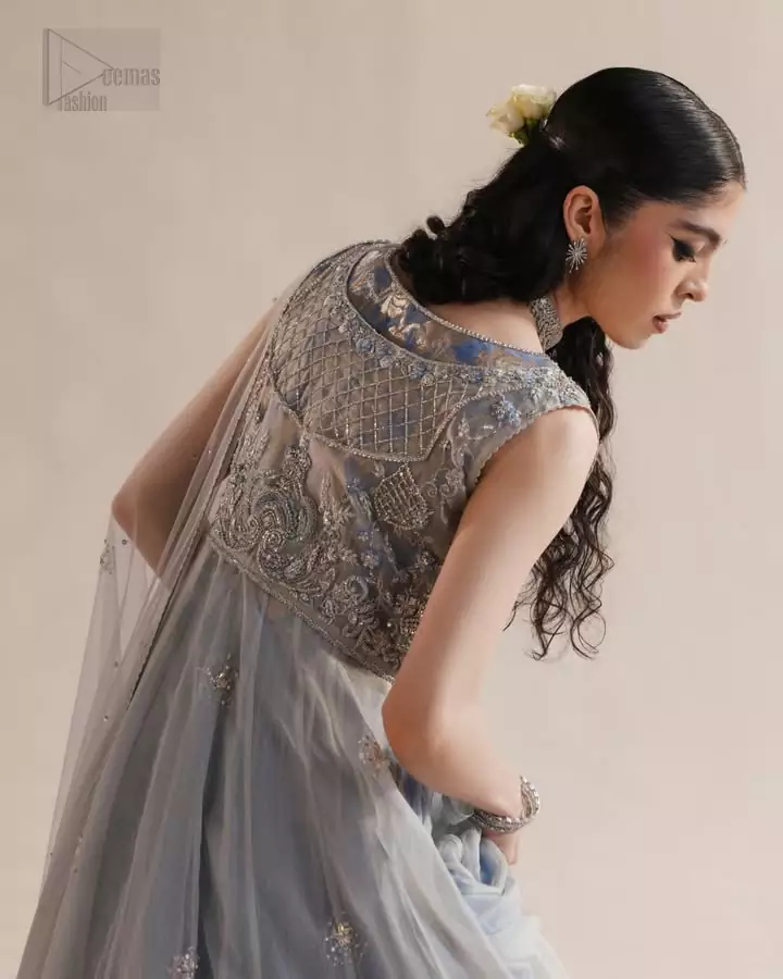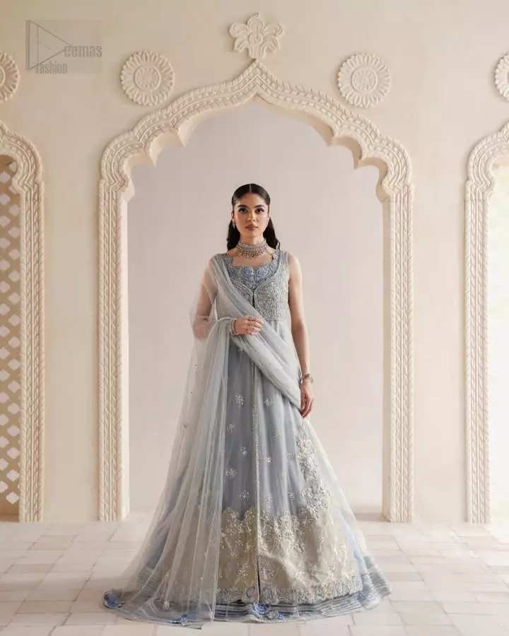 An ice-blue front-open gown meets an inner maxi to create formal wear so dazzling and dreamy that the audience can’t help but admire its magnificence. This lavish attire is crafted from organza and refined with a pearl-detailed appliqué of silver-thread embroidery. The sleeveless gown features a side-opening design and a perfectly round neckline, which contribute to its divine glow. A final touch of its pristine net dupatta completes this outfit for Pakistani parties, events and nikkah ceremonies. The interplay of sheer layers and soft structure creates a silhouette that feels both weightless and regal. Every detail is thoughtfully composed to capture light beautifully, ensuring a captivating presence at every occasion.
