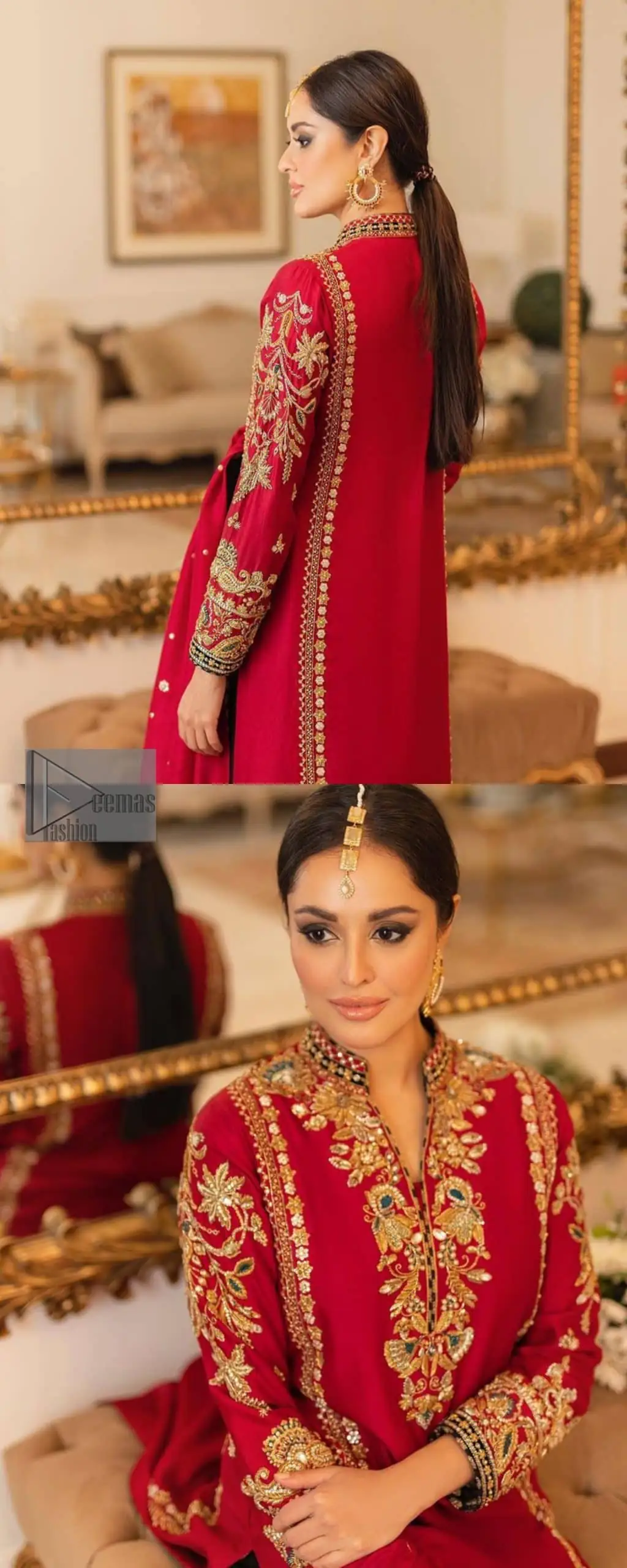 The forever favourite red dress is channelling your inner diva. A luxury long red shirt rendered with intimate embroidery in golden colour to make your party blazing and remembering. It is highlighted with tilla, dabka, kora, and pearls, the perfect blooming outfits in our collection. The collar neckline and full sleeves add attractiveness to the outfit. It comes with black pants for a more formal look at any precious event. The border of the pants is adorned with golden embroidery as well. End this look with a red dupatta embellished with a four-sided border, and sequins spray all over for your constant love of red.